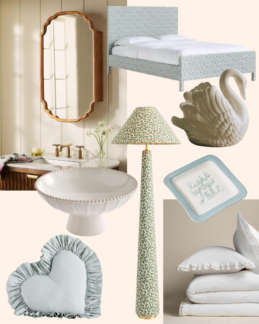 Printed floor lamp, ruffle towels, swan vase, prettiest bathroom mirror cabinet, rattan scallop tray