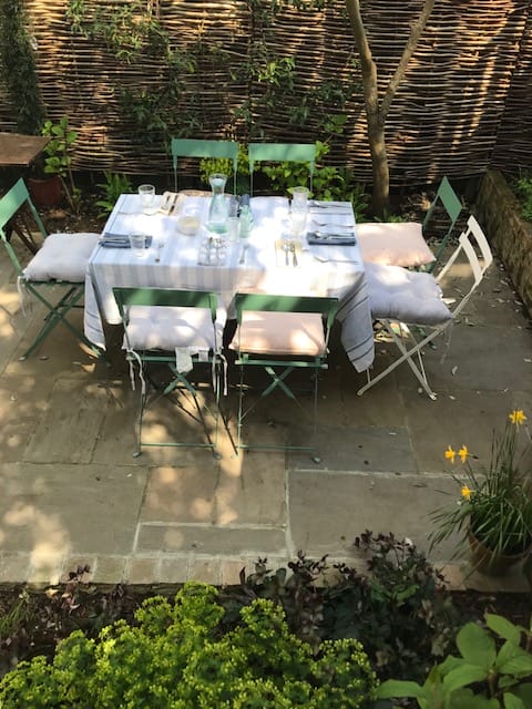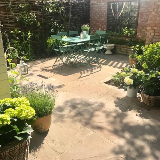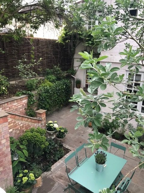 So, we now have a lovely local gardener called Nicky Erskine (I can share her details  with anyone who’s interested – email me), and she is the first gardener I have had who really ‘gets me’ and what I like (I’m sure it will come as no surprise that I am really fussy!!). She’s pretty low-key, and just comes as and when we need her. Initially, she just used to help manage and maintain the plants at the back (but by then the back was stuffed FULL of plants and flowers – you haven’t even been able to see the orange fence for years now!), then gradually started to do more and more – gently suggesting replacements for existing plants, removing things (like the ‘aggressive’ ivy, which I had planted as it covers so quickly if that’s what you need), which was slowly strangling many of the other plants; pruning, and just general maintenance. But I had chatted to her often about wanting to tackle the front, and my idea of wanting to pave over the (muddy, patchy, redundant) patch of grass. So we started to hatch a plan. The work first started last Summer, when we were in Italy on holiday. But it was really only this year that Nicky started to plant the space (as well as planting  plenty of new plants and flowers, she also moved many things around, to better portions light-wise etc.). But as you saw from Instagram, it was only in the Spring that things really starting growing up and out. And have grown loads more since. So it’s finally starting to look like the mood boards (yes, she did mood boards!). So that’s almost a year since the work first started. But to be honest, I was happy for the planting to be more gradual. Financially there were obvious benefits, but also it was great to see how things grew; how we were using the space etc. etc. And it’s still a work in progress – most of the planting is now done, but we’re going to add a few more features, such as rusted metal girds for trellises on the walls (on the house for the roses – see below) and on the walls either side of the mirror for the mulennekia – also see below). I will share all of these design details  in my next garden post, I promise).